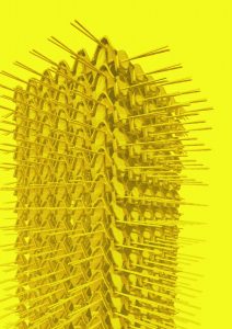 Le jaune traverse l’exposition. Il se dépose sur les murs, filtre la lumière des néons, tamise les fenêtres, s’infiltre dans les sculptures et les objets. C’est une couleur qui ne se contente pas d’habiller l’espace : elle l’inonde, l’altère, l’ouvre. Jaune d’œuf, cœur fragile protégé par une coquille ; jaune lumineux, comme une trouée solaire dans une pièce close. Il porte en lui cette double tension : matière intérieure, intime, et éclat extérieur, irradiant. Ni signal d’alerte ni simple décor, le jaune agit ici comme une invitation à franchir la limite, à imaginer une possible sortie.